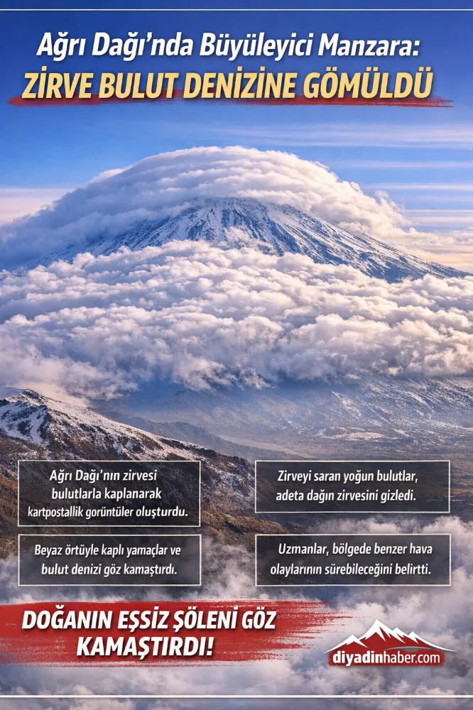 Her mevsim farklı bir güzelliğe bürünen Ağrı Dağı, bu kez zirvesini saran bulut deniziyle doğa tutkunlarına unutulmaz anlar yaşattı. Bölgedeki bu eşsiz manzara, hem yerli halkın hem de doğa meraklılarının ilgisini çekmeye devam ediyor.
