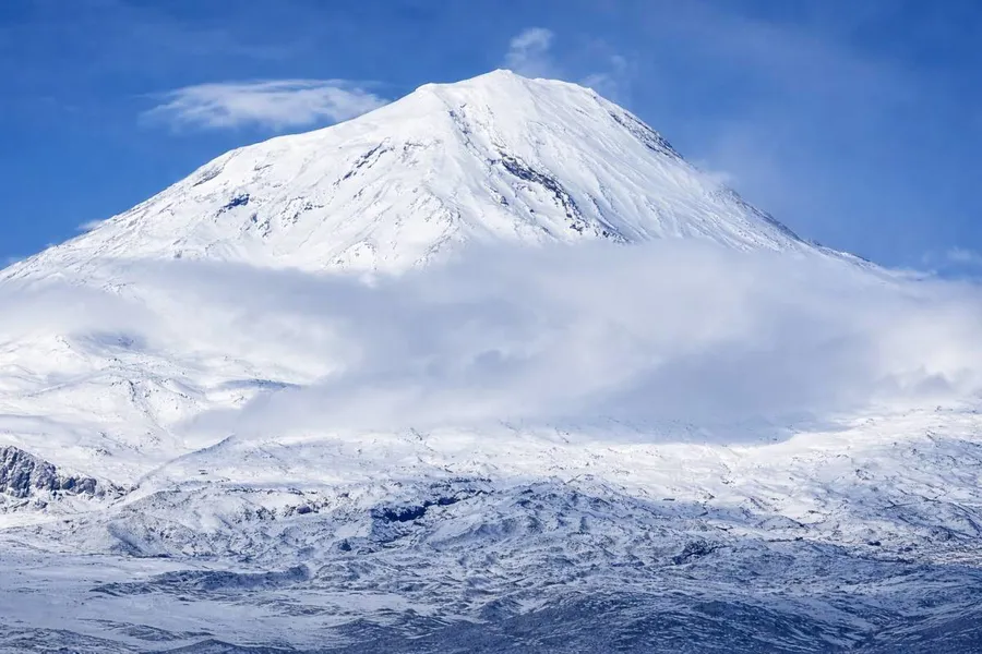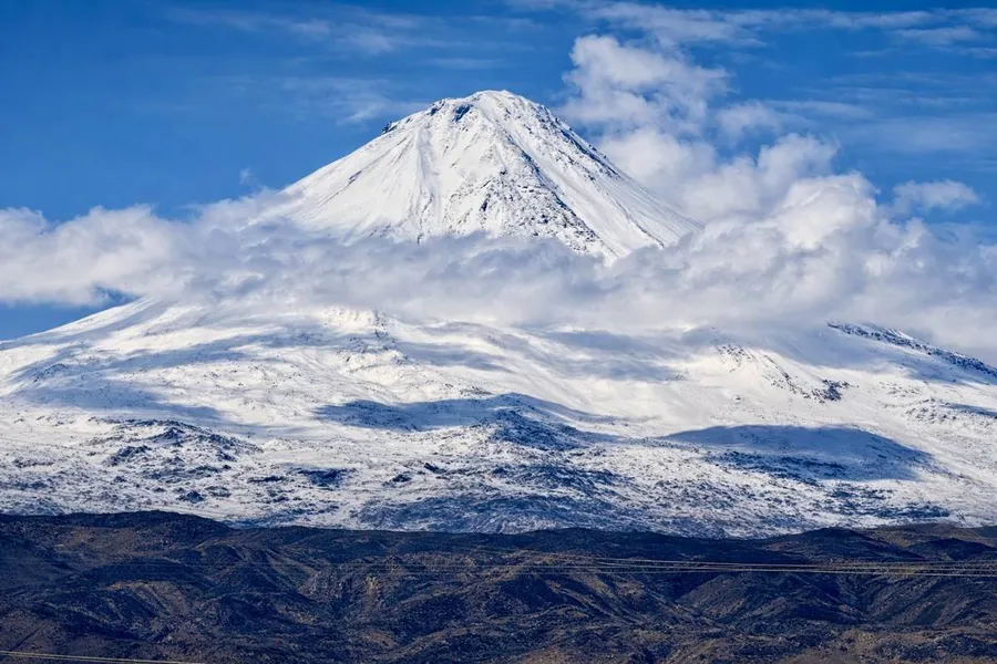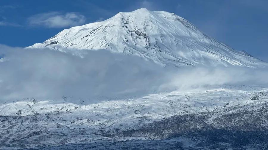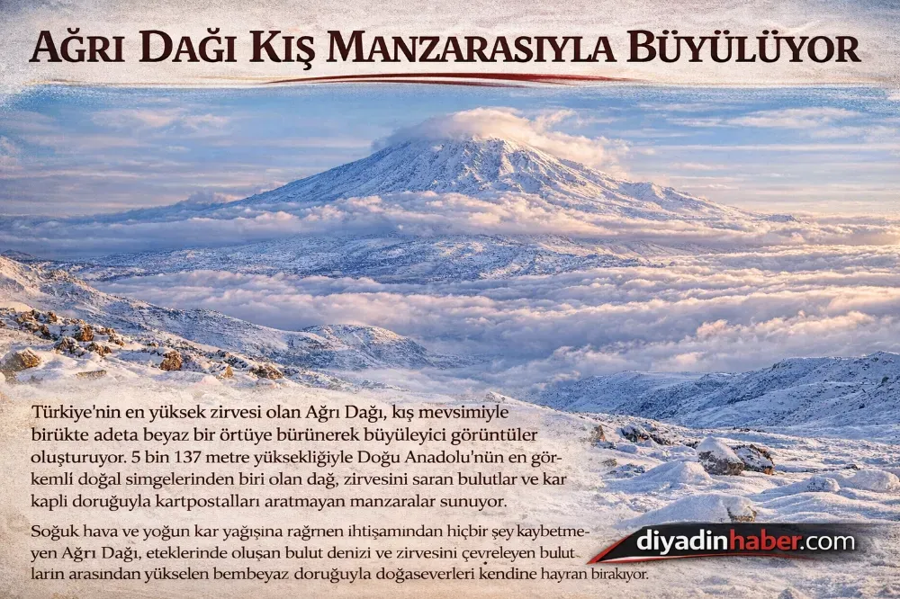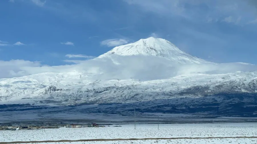 Soğuk hava ve yoğun kar yağışına rağmen ihtişamından hiçbir şey kaybetmeyen Ağrı Dağı, her mevsim farklı bir güzelliğe bürünse de kış aylarında ortaya çıkan manzarasıyla doğaseverleri kendine hayran bırakıyor. Zirvesini çevreleyen bulutların arasından yükselen bembeyaz doruk, doğanın görkemini bir kez daha gözler önüne seriyor.