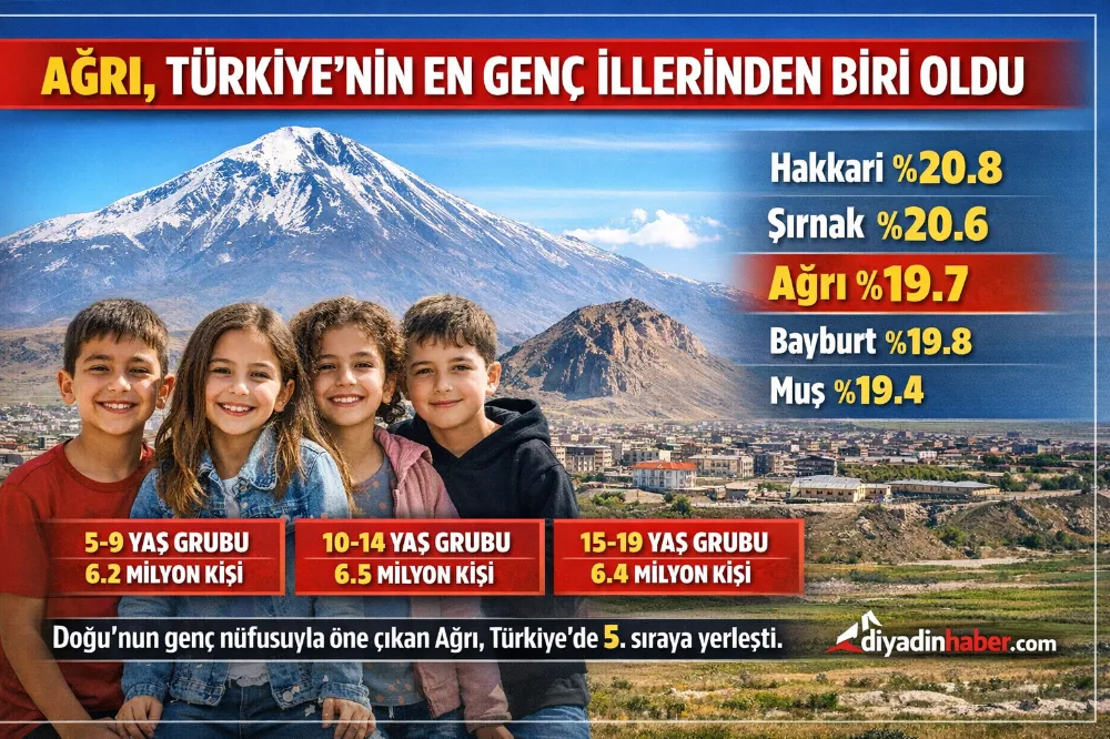 Açıklanan istatistiklere göre Ağrı, yüzde 19,7’lik genç nüfus oranıyla Türkiye’de genç nüfusun en yoğun olduğu ilk 20 il arasında 5’inci sıraya yerleşti.