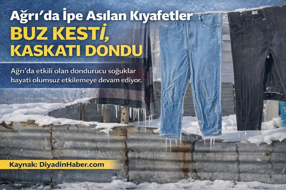 Ağrı’da kış şartları, hem günlük yaşamı hem de doğayı etkilerken, buz tutan kıyafetler soğuk havanın en çarpıcı göstergelerinden biri oldu.
