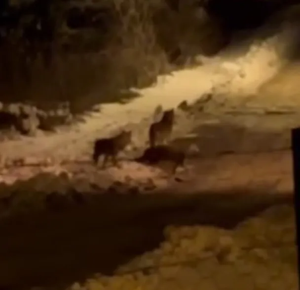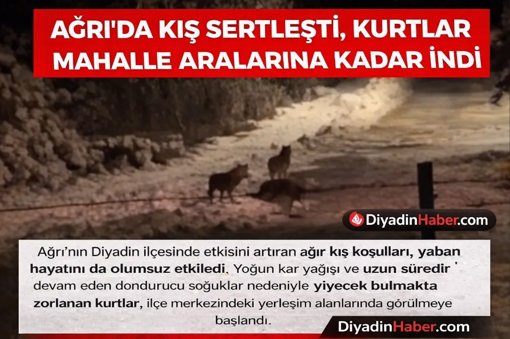 Diyadin’e bağlı Atatürk Mahallesi’nde gece saatlerinde ortaya çıkan kurtlar, sokak aralarında bir süre dolaşarak yiyecek aradı. Mahalle sakinleri tarafından cep telefonu kamerasıyla kaydedilen görüntülerde, kurtların karla kaplı yollar üzerinde temkinli şekilde ilerlediği ve çevreyi kontrol ettiği dikkat çekti.