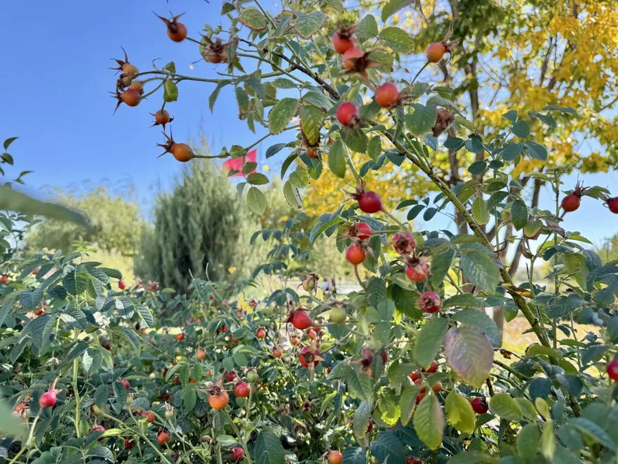 Şehrin yüksek kesimlerinde ve köy yolları boyunca ağaçlardan sarkan kuşburnuları, kırmızı renkleriyle görsel bir şölen oluşturuyor.