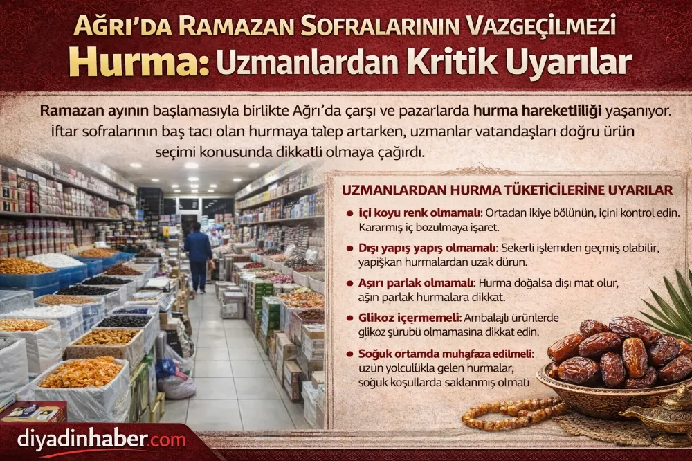 Ramazan ayının başlamasıyla birlikte Ağrı’da çarşı ve pazarlarda hurma hareketliliği yaşanıyor. İftar sofralarının baş tacı olan hurmaya talep artarken, uzmanlar vatandaşları doğru ürün seçimi konusunda dikkatli olmaya çağırdı.