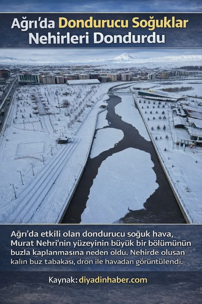 Ağrı’da kış, bu kez sessiz ama sert yüzünü gösterdi. Termometrelerin eksi dereceleri işaret ettiği kentte, dondurucu soğuklar Murat Nehri’ni adeta durma noktasına getirdi.