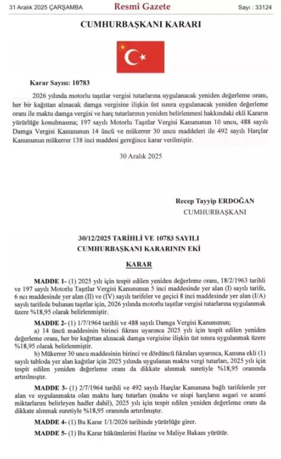 Resmî Gazete’de yayımlanan kararla birlikte MTV tutarları, 1 Ocak 2026 tarihinden itibaren geçerli olmak üzere yüzde 18,95 oranında artırıldı.
