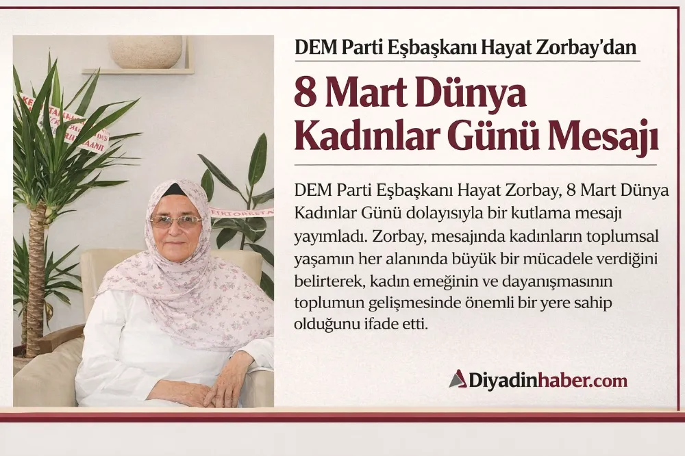Mesajında kadınların toplumun temel yapı taşı olduğuna dikkat çeken Zorbay, kadınların hak ettiği eşit ve adil yaşam koşullarına kavuşmasının önemine değindi. Kadınların eğitimden ekonomiye, siyasetten sosyal yaşama kadar her alanda daha fazla söz sahibi olması gerektiğini belirten Zorbay, kadınların mücadelesinin desteklenmesi gerektiğini ifade etti.Hayat Zorbay mesajının sonunda, başta Diyadin’de yaşayan kadınlar olmak üzere tüm kadınların Mart Dünya Kadınlar Günü’nü kutlayarak, kadınların dayanışma ve mücadele ruhunun her zaman büyüyerek devam etmesini temenni etti.
