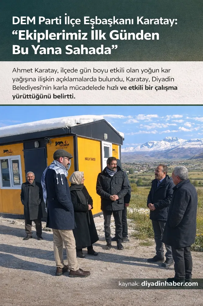 Ahmet Karatay, ilçede gün boyu etkili olan yoğun kar yağışına ilişkin açıklamalarda bulundu. Karatay, Diyadin Belediyesi’nin karla mücadelede hızlı ve etkili bir çalışma yürüttüğünü belirtti.