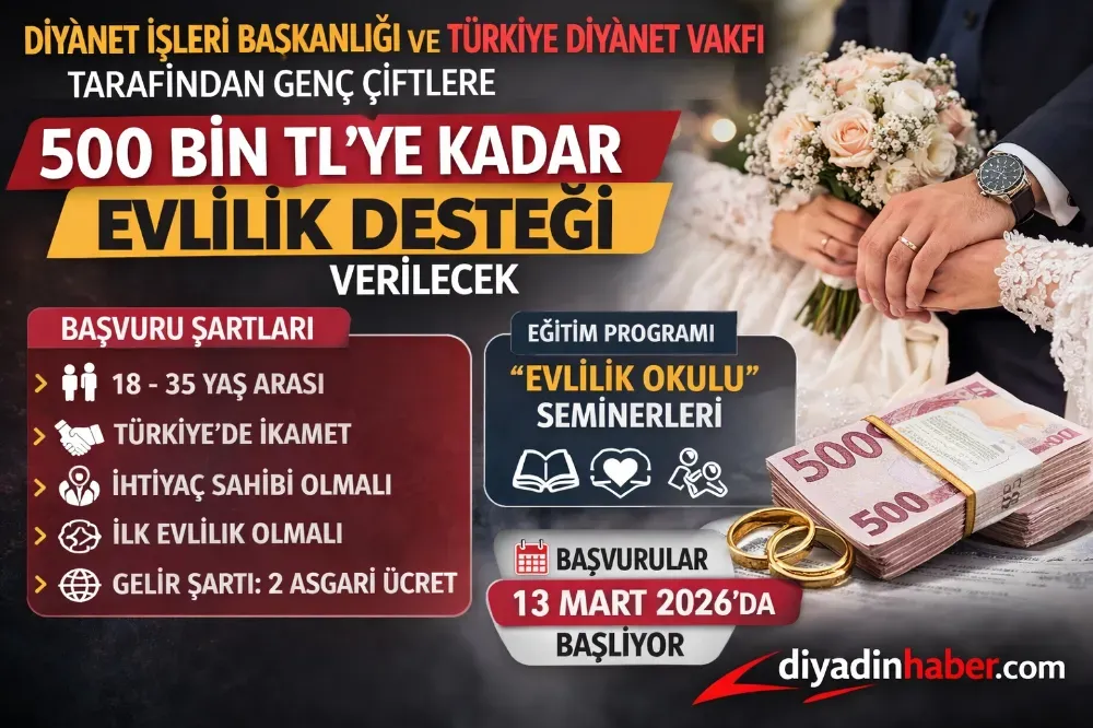 Diyanet İşleri Başkanlığı ile Türkiye Diyanet Vakfı tarafından yürütülecek proje kapsamında, belirlenen şartları sağlayan genç çiftlere 500 bin TL’ye kadar karşılıksız destek verileceği açıklandı.