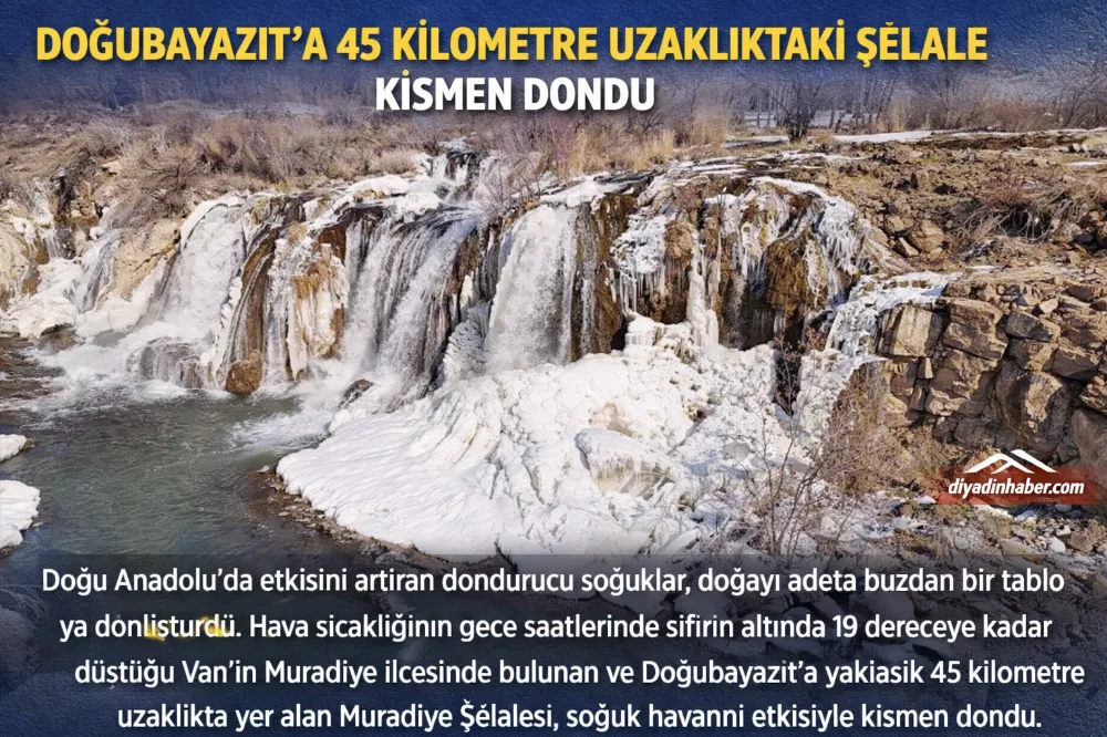 Hava sıcaklığının gece saatlerinde sıfırın altında 19 dereceye kadar düştüğü Van’ın Muradiye ilçesinde bulunan ve Doğubayazıt’a yaklaşık 45 kilometre uzaklıkta yer alan Muradiye Şelalesi, soğuk havanın etkisiyle kısmen dondu.