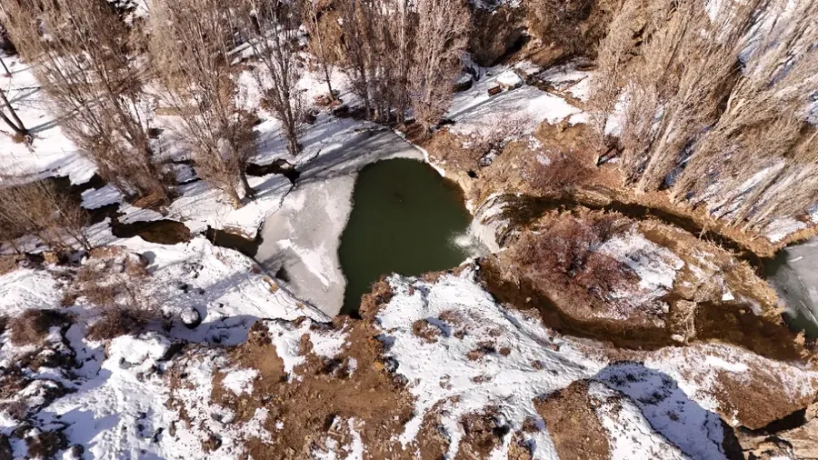 Muradiye Şelalesi’nde oluşan eşsiz manzara dron ile havadan görüntülendi. Yukarıdan kaydedilen görüntülerde, şelalenin beyaz kar örtüsü ve buz kütleleri arasındaki görkemli akışı net şekilde görüldü. Kısmen donan suyun oluşturduğu kristal görünümler, bölgedeki kışın sert yüzünü bir kez daha ortaya koydu.