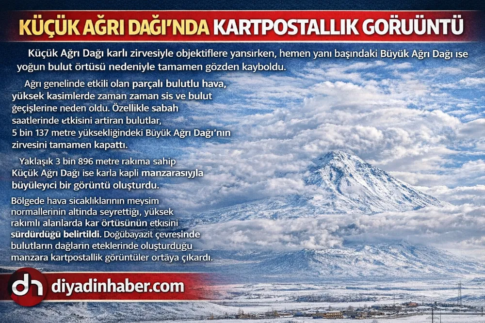 Yaklaşık 3 bin 896 metre rakıma sahip Küçük Ağrı Dağı’nın zirve hattında yer yer bulut kümeleri geçiş yapsa da dağın büyük bölümü net bir şekilde izlenebildi. Kar örtüsünün beyaz tonları ile gökyüzündeki gri bulutların oluşturduğu kontrast, doğaseverler ve fotoğraf tutkunları için eşsiz manzaralar oluşturdu. Özellikle günün ilk ışıklarıyla birlikte ortaya çıkan görüntüler, bölge halkı tarafından ilgiyle takip edildi.