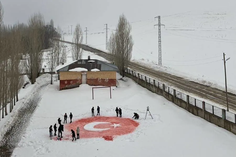 Düzgören İlkokulu ve Ortaokulu öğrencileri, öğretmenlerinin rehberliğinde karla kaplı okul bahçesinde Türk bayrağı oluşturdu.