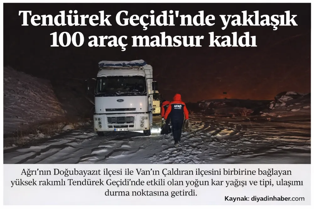 Gün boyunca aralıklarla etkisini gösteren kar yağışı, gece saatlerinde şiddetini artırarak tipiye dönüştü. Görüş mesafesinin yer yer birkaç metreye kadar düştüğü Tendürek Geçidi’nde ilerleyemeyen tır, kamyon ve diğer araçlar yol kenarında beklemek zorunda kaldı.