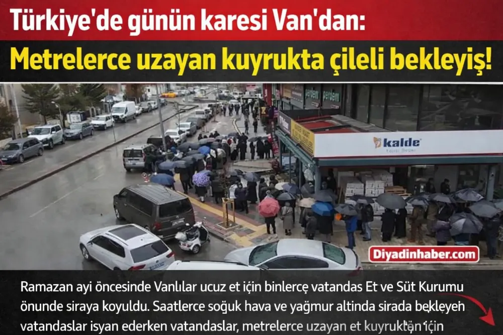 Van’ın İpekyolu ilçesinde bulunan Et ve Süt Kurumu (ESK) satış mağazası önünde Ramazan öncesi sabahın ilk ışıklarıyla birlikte uzun uzadıya et kuyrukları oluştu. Artan et fiyatlarına karşı uygun fiyatlı et almak isteyen vatandaşlar soğuk hava ve yağmur altında ucuz et alabilmek için kuyruğa giriyor.