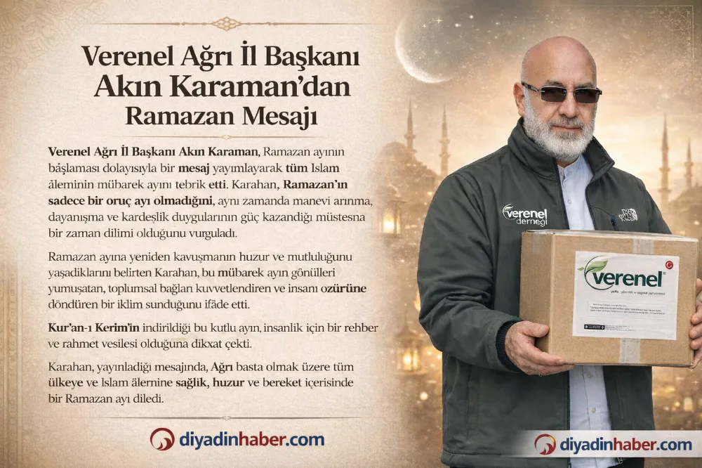Verenel Ağrı İl Başkanı Akın Karaman, mesajının sonunda Ramazan ayının başta Ağrı olmak üzere tüm ülkeye ve İslam âlemine hayırlar getirmesini dileyerek, sağlık, huzur ve bereket içerisinde bir Ramazan geçirilmesi temennisini paylaştı.