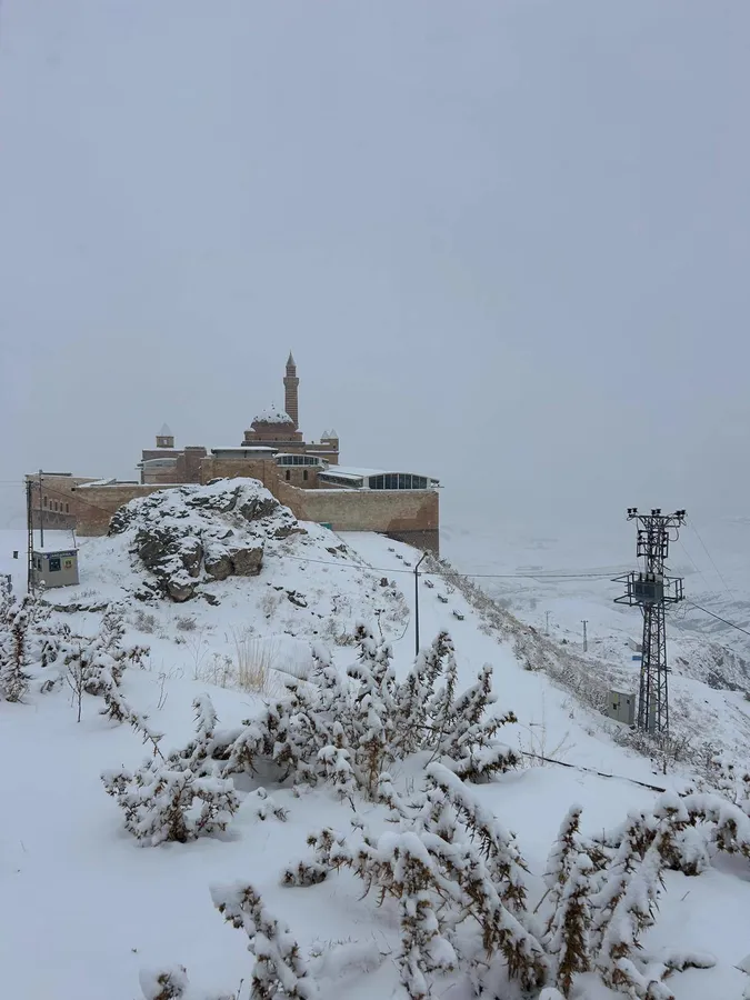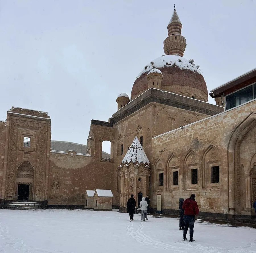 Doğubayazıt Ovası’na hâkim bir noktada bulunan tarihi yapı, yağan karla birlikte hem yerli hem de yabancı ziyaretçilerin ilgisini çekti. Osmanlı, Selçuklu ve Pers mimari izlerini bir arada barındıran İshak Paşa Sarayı, beyaz örtü altında ihtişamını bir kez daha gözler önüne serdi.