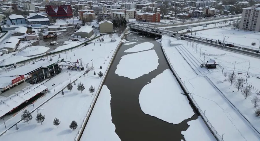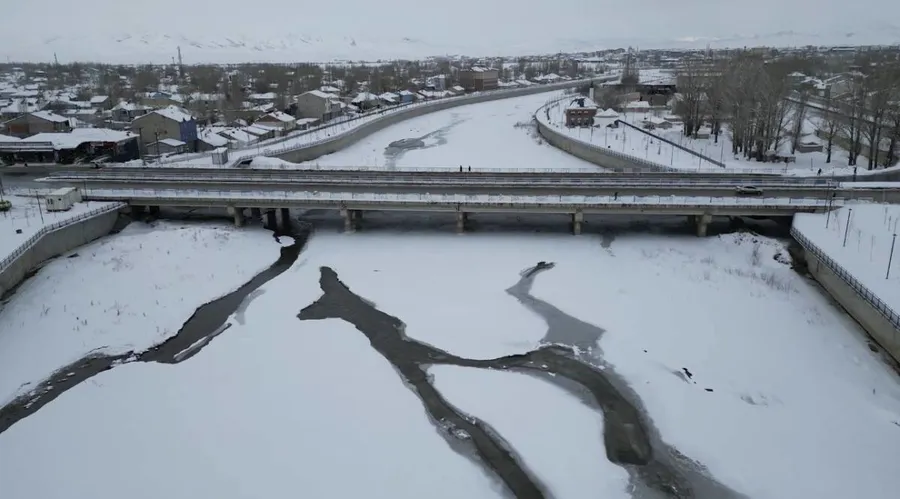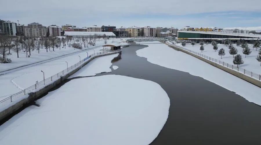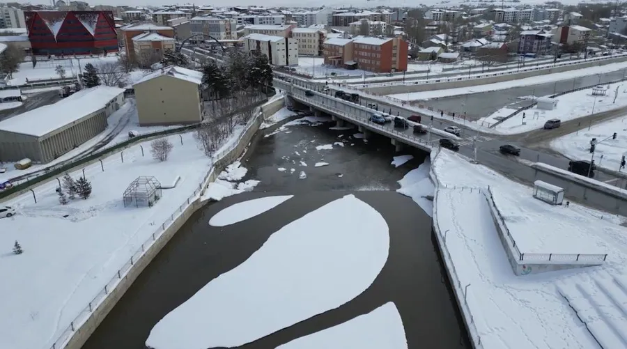 Akışkanlığıyla bilinen Murat Nehri, soğuk havanın etkisiyle yer yer tamamen donarken, ortaya çıkan manzara görenleri hem şaşırttı hem de hayran bıraktı. Doğanın kışla verdiği bu mücadele, dron ile havadan kaydedilerek eşsiz görüntülerle belgelendi.