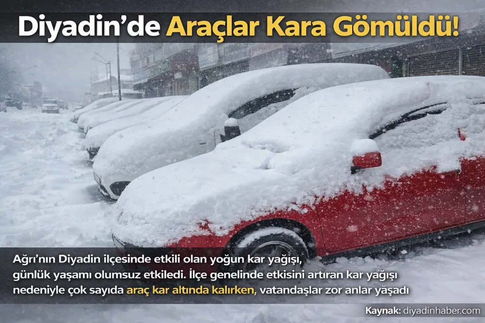 Ağrı’nın Diyadin ilçesinde etkili olan yoğun kar yağışı, günlük yaşamı olumsuz etkiledi. İlçe genelinde etkisini artıran kar yağışı nedeniyle çok sayıda araç kar altında kalırken, vatandaşlar zor anlar yaşadı.