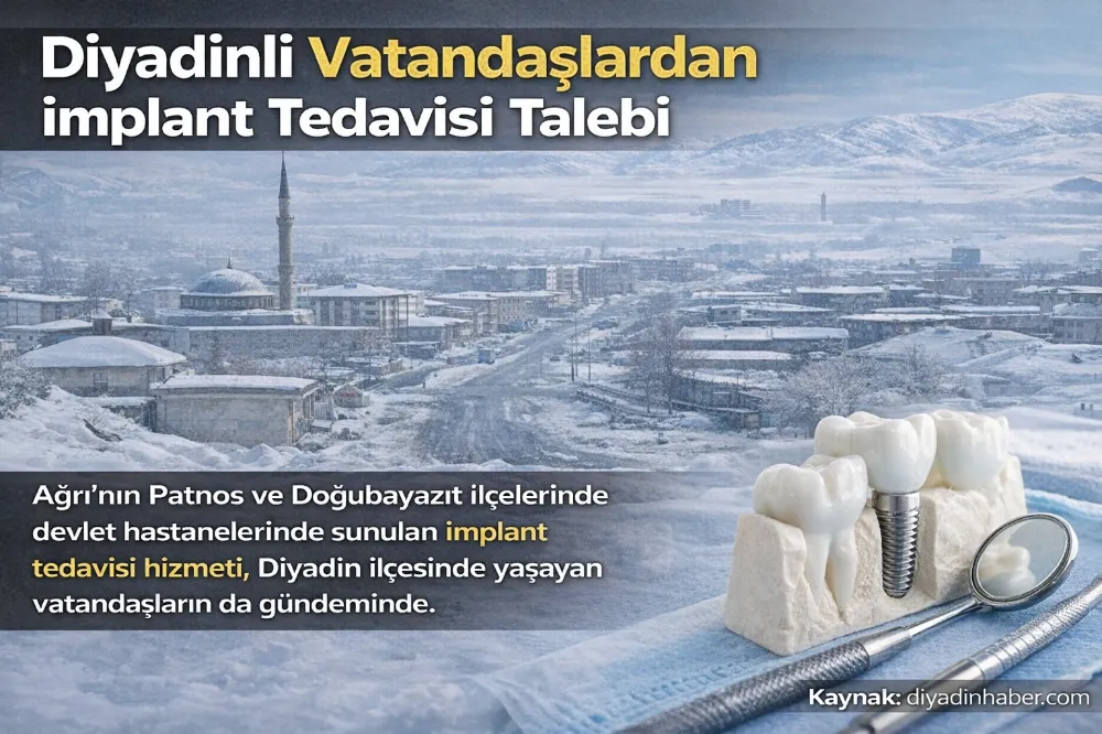 Vatandaşlar tarafından yapılan çağrıda, Ağrı İl Sağlık Müdürlüğü görevini yürüten Doç. Dr. Esra Beşer’e seslenilerek, Diyadin ilçesinde implant tedavisi hizmetinin hayata geçirilmesi için destek istendi. İlçede yaşayan birçok hastanın Ağrı'ya Patnos'a ve Doğubayazıt’a gitmek zorunda kaldığına dikkat çekilen açıklamada, özellikle yaşlı ve kronik rahatsızlığı bulunan vatandaşların bu durumdan olumsuz etkilendiği vurgulandı.