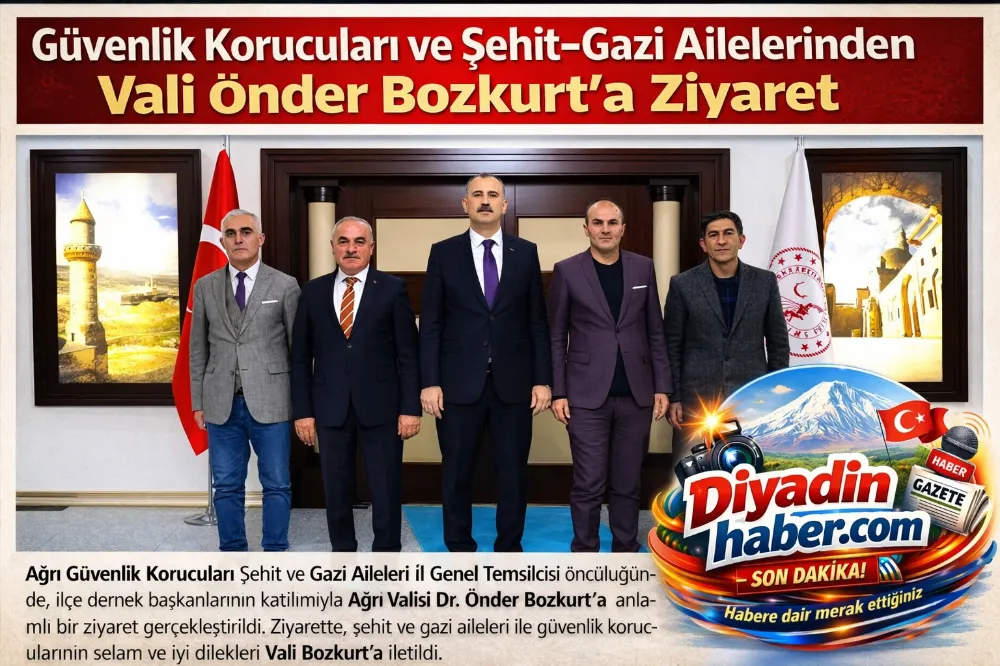 Gerçekleşen ziyarete; Diyadin Dernek Başkanı Kazım Polat, Taşlıçay Dernek Başkanı Ömer Kaya ve Doğubeyazıt Dernek Başkanı Metin Konyar da katıldı. Heyet, kısa süre önce Ağrı Valiliği görevine atanan Vali Dr. Önder Bozkurt’u makamında ziyaret ederek hem hayırlı olsun dileklerini sundu hem de sahada görev yapan güvenlik korucuları ile şehit ve gazi ailelerinin duygu ve beklentilerini aktardı.